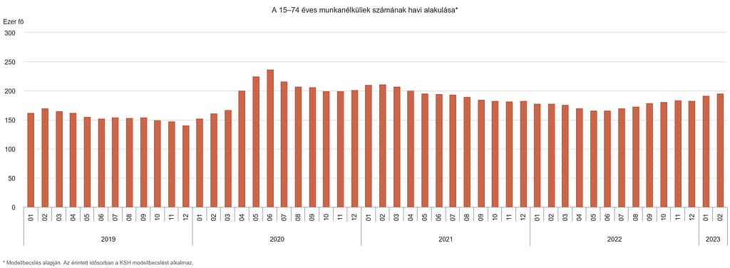 2023 februárjában a munkanélküliek száma 196 ezer fő volt, ami 17 ezer fővel meghaladta az egy évvel korábbit