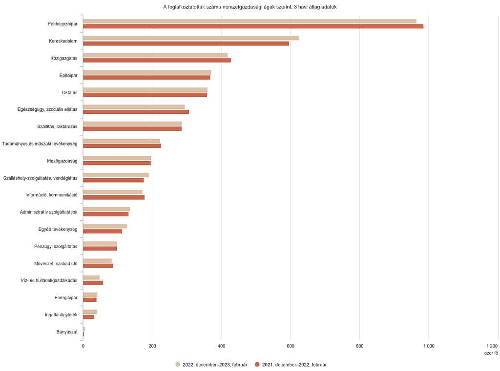 2022 december – 2023 februárban a legnagyobb mértékben a kereskedelemben (28 ezer fővel) bővült a foglalkoztatás az előző évihez képest.